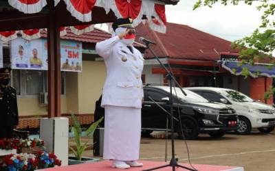 Kubu Raya - Upacara pengibaran bendera Merah Putih peringatan HUT RI Ke-76,Tahun 2021 Kecamatan Sungai Kakap, Kabupaten Kubu Raya yang dilaksanakan di halaman Kantor Camat Sungai Kakap berlangsung hikmad dengan penerapan protokol kesehatan (prokes) Selasa (17/8 ...