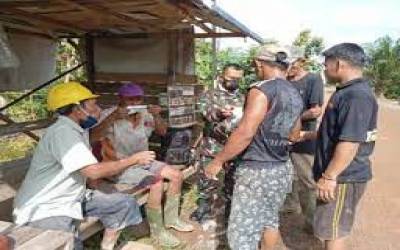 Kubu Raya - Babinsa Koramil 1207-06/Sungai Ambawang Kabupaten Kubu Raya Kalimantan Barat membagikan masker kepada masyarakat di Dusun Maju Jaya, Desa Kuala Mandor B, Kecamatan Kuala Mandor B, Kabupaten Kubu Raya, Minggu (25/07/2021). ...