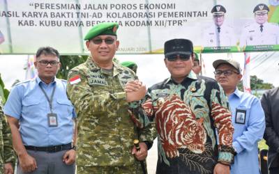 PROKOPIM KUBU RAYA - Bupati Kubu Raya Sujiwo bersama Panglima Daerah Militer (Pangdam) XII/Tanjungpura Mayjen TNI Jamallulael meresmikan Jalan Poros Ekonomi hasil program Karya Bakti TNI Angkatan Darat di Desa Rasau Jaya Dua, Kecamatan Rasau Jaya, Kamis (8/1/2026). Bupati Sujiwo menyampaikan ap ...