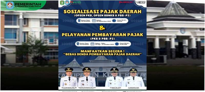 Jumat, 26 September 2025 | Kubu RayaPemerintah Kabupaten Kubu Raya melalui Badan Pendapatan Daerah (Bapenda) terus mendorong kesadaran masyarakat dalam memenuhi kewajiban perpajakan. Salah satu langkahnya adalah dengan menggelar kegiatan Sosialisasi Pajak Daerah sekaligus Pelayanan Pembayaran Pajak yang akan dilaksanakan di Kantor Desa Pal Sembilan pada Selasa, 30 September 2025 mulai pukul 08.30 WIB hingga selesai.