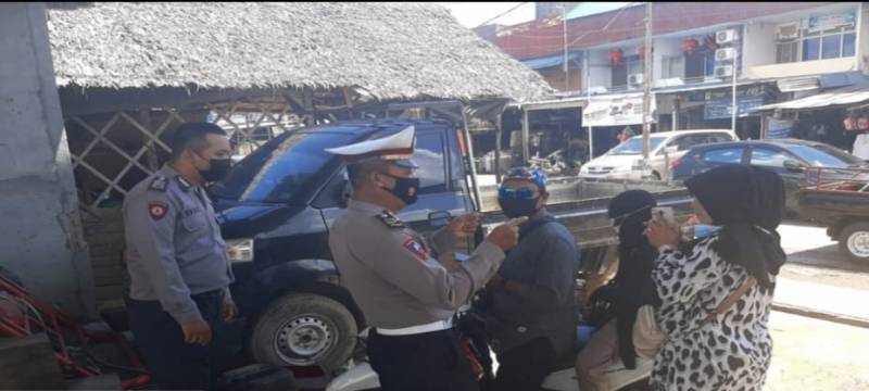 Posko Covid-19 Sungai kakap, Kapolsek beserta Petugas Bagikan Masker Kepada Pengunjung Pasar