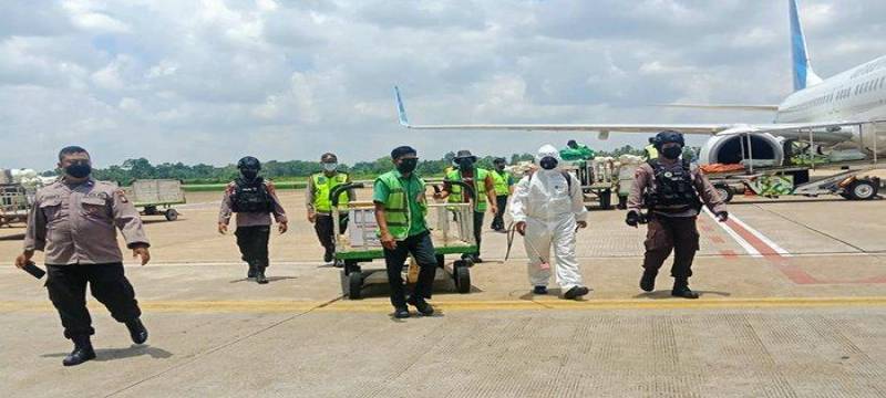 Sebanyak 1,708 Vial terdiri vaksin Sinovac dan Moderna tiba di Bandara Internasional Supadio Pontianak di sambut dengan pengawalan ketat petugas Bandara dan aparat kepolisian dari Polres Kubu Raya dan Anggota Brimob Polda Kalbar.