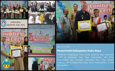 Dalam rangka melaksanakan program pembudayaan Gemar Membaca Tingkat Daerah, maka Pemkab Kubu Raya melalui Dinas Perpustakaan dan Kearsipan Kabupaten Kubu Raya menyelenggarakan lomba bercerita tingkat SD/MI tahun 2024 dan dihadiri langsung oleh Pj Bupati Kubu Raya Syarif Kamaruzaman, di Aula Kepon ...