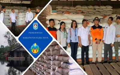 Penyerahan secara simbolis bantuan sosial beras Cadangan Pangan Pemerintah Daerah (CPPD) sebanyak 3.004 Kg dan bantuan BNPB Pusat kepada warga terdampak bencana alam banjir melalui Kepala Dinas Sosial dan Kepala BPBD kepada Pemerintah Kecamatan Kuala Mandor B, di Gudang Beras Bulog Sungai Raya pa ...
