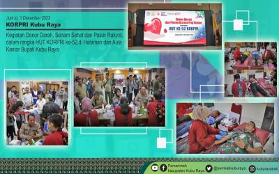 Kubu Raya - Kegiatan Donor Darah, Senam Sehat dan Pasar Rakyat, dalam rangka peringatan HUT Korpri ke-52 dilaksanakan di Halaman dan Aula Kantor Bupati Kubu Raya pada Jumat (1/12).Dalam sambutannya pada saat membuka kegiatan Bupati Kubu Raya Muda Mahendrawan ...