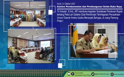 Kubu Raya - Asisten Perekonomian dan Pembangunan Setda Kubu Raya Tri Indristuti, S.Hut., MT membuka kegiatan Sosialisasi Peraturan Bupati tentang Peta Lari Galaksi (Giat Pembinaan Terintegrasi) Perusahaan Umum Daerah Aneka Usaha Menanjak Bahagia, di Ruang Pamong Praja I pada ...