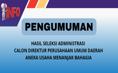 Pengumuman - HASIL SELEKSI ADMINISTRASI CALON DIREKTUR PERUSAHAAN UMUM DAERAH ANEKA USAHA MENANJAK BAHAGIA. Unduh berkas disini.