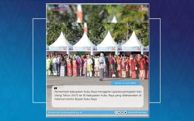 Kubu Raya - Pemerintah Kabupaten Kubu Raya menggelar Upacara peringatan Hari Ulang Tahun (HUT) ke 16 Kabupaten Kubu Raya yang dilaksanakan di Halaman Kantor Bupati Kubu Raya pada Senin, (17/07).Upacara peringatan Hari Jadi Kubu Raya ke-16 Tahun tersebut d ...