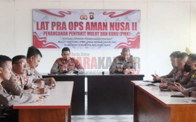 KUBU RAYA - Kabag Ops Polres Kubu Raya AKP Hoerrudin, S.I.K buka latihan Pra Operasi Kepolisian Terpusat Aman Nusa II dalam rangka penanganan Penyakit Mulut dan Kuku tahun 2022 guna menghadapi Hari Raya Idul Adha di Aula lantai II Polres Kubu Raya Kecamatan Su ...