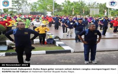 Kubu Raya - Pemerintah Kabupaten Kubu Raya gelar senam sehat dalam rangka memperingati Hari KORPRI ke-50 Tahun di Halaman Kantor Bupati Kubu Raya pada Jumat, (26/11).Dalam sambutannya, Yusran Anizam selaku Ketua Dewan Penguru ...