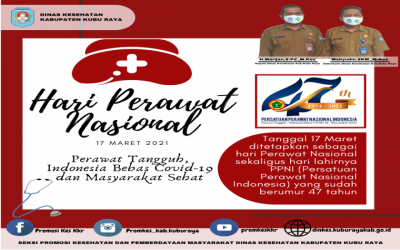 Kubu Raya - Dinkes.kuburayakab.go.id- Bulan Maret menjadi hari istimewa bagi seluruh Perawat di Indonesia. Pada bulan ini tepatnya tanggal 17 Maret merupakan Hari Perawat Nasional yang juga merupakan hari lahir organisasi Profesi Perawat yakni Persatuan Perawat ...