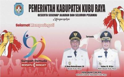 KUBU RAYA - Pemerintah Kabupaten Kubu Raya (KKR) melalui Bupati Kubu Raya, Muda Mahendrawan, SH dan Wakil Bupati Kubu Raya Sujiwo, SE serta segenap jajaran mengucapkan Selamat Hari Sumpah Pemuda Ke-92 pada 28 Oktober 2020. "Sumpah Pemuda, Bersatu dan Bangkit.".