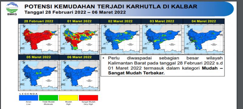 BMKG Supadio memprakirakan potensi sangat mudah terjadi kebakaran hutan dan lahan masih akan berlangsung hingga tanggal 1 maret 2022. Hujan diprakirakan terjadi di sebagian wilayah Kalimantan Barat mulai tanggal 01 Maret 2022 dengan intensitas dominan ringan dan tidak merata. Diprakirakan hujan intensitas sedang hingga lebat di sebagian besar wilayah Kalbar akan terjadi mulai tanggal 04 maret 2022. Dengan kondisi tersebut, masih perlunya peningkatan kewaspadaan menghadapi potensi terjadinya kebakaran hutan dan lahan, setidaknya hingga tanggal 04 maret 2022.