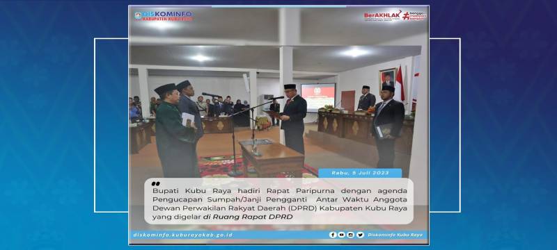 Kubu Raya - Bupati Kubu Raya hadiri Rapat Paripurna dengan agenda Pengucapan Sumpah/Janji Pengganti Antar Waktu Anggota Dewan Perwakilan Rakyat Daerah (DPRD) Kabupaten Kubu Raya yang digelar di Ruang Rapat DPRD pada Rabu, (05/07/2023).