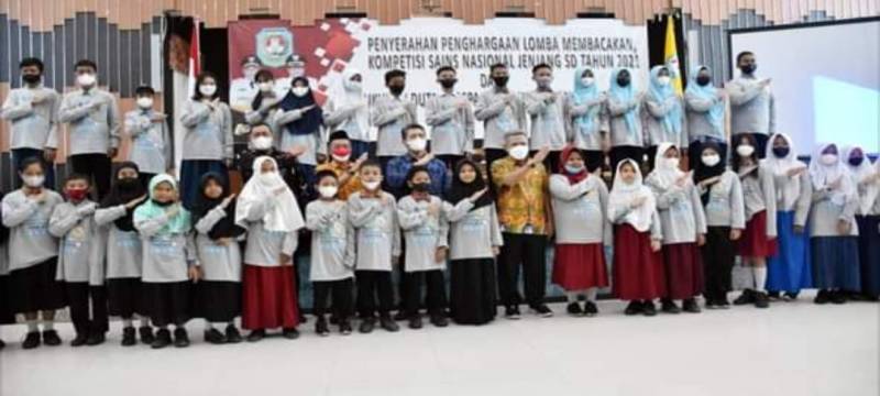kubu Raya - Bupati Kubu Raya Muda Mahendrawan menyerahkan piagam penghargaan kepada pemenang lomba Membacakan Kompetensi Sains Nasional Jenjang SD Tahun 2021 dan mengukuhan Duta Geospasial Cilik tahun 2022 di ruang Praja Utama aula kantor bupati, Kamis (6/1/2022) siang.