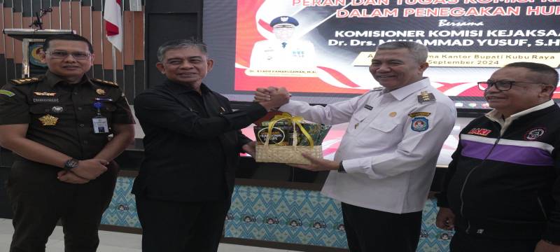 PROKOPIM KUBU RAYA - Pemerintah Kabupaten Kubu Raya bekerja sama dengan Laskar Anti Korupsi Indonesia (LAKI) Kabupaten Kubu Raya menggelar kegiatan Sosialisasi Peran dan Tugas Komisi Kejaksaan dalam Penegakan Hukum, Rabu (11/9/2024), di Aula Praja Utama Kantor Bupati Kubu Raya. Sosialisasi menghadirkan Komisioner Komisi Kejaksaan RI Muhammad Yusuf sebagai narasumber. Penjabat (Pj) Bupati Kubu Raya Syarif Kamaruzaman mengapresiasi kehadiran Muhammad Yusuf yang pernah menjabat Kepala Kejaksaan Tinggi Kalimantan Barat.