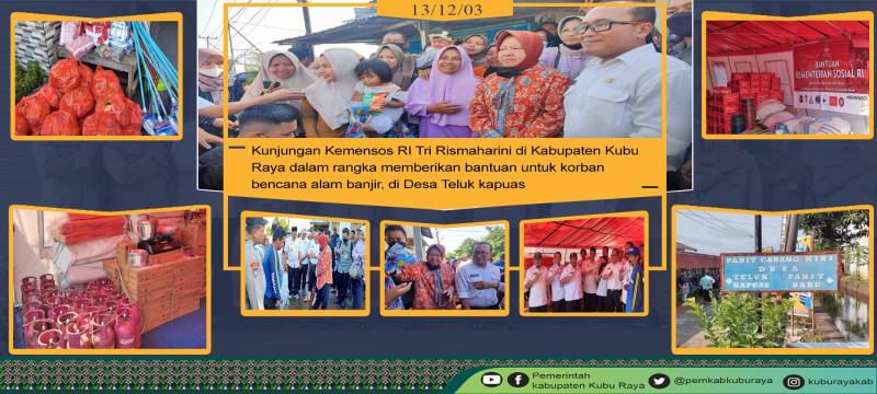 Kubu Raya - Kunjungan Kementerian Sosial Republik Indonesia RI Tri Rismaharini di Kabupaten Kubu Raya dalam rangka memberikan bantuan untuk korban Bencana Alam Banjir, di Desa Teluk Kapuas diterima langsung oleh Wakil Bupati Kubu Raya Sujiwo beserta Kepala Perangkat Daerah pada Rabu (13/12).
