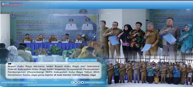 Kubu Raya - Bupati Kubu Raya bersama Wakil Bupati Kubu Raya dan Sekretaris Daerah Kabupaten Kubu Raya hadiri Kegiatan Musyawarah Perencanaan Pembangunan (Musrenbang) RKPD Kabupaten Kubu Raya Tahun 2024 Kecamatan Rasau Jaya yang digelar di Aula Kantor Camat Rasau Jaya pada Senin, (30/01).
