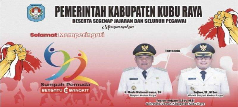 KUBU RAYA - Pemerintah Kabupaten Kubu Raya (KKR) melalui Bupati Kubu Raya, Muda Mahendrawan, SH dan Wakil Bupati Kubu Raya Sujiwo, SE serta segenap jajaran mengucapkan Selamat Hari Sumpah Pemuda Ke-92 pada 28 Oktober 2020.