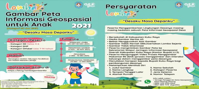 Kubu Raya - Pemerintah Kabupaten Kubu Raya Kalimantan Barat (Kalbar) menggelar lomba menggambar peta informasi Geospasial untuk anak SD dan SMP, sebagai upaya melibatkan anak-anak dalam pemetaan Geospasial yang menjadi program WebGis 'Kepong Bakol' Kubu Raya dan ini menjadi yang pertama di Kalbar.