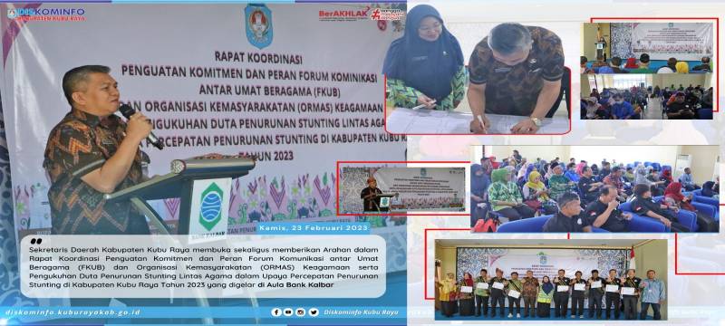 Kubu Raya - Sekretaris Daerah Kabupaten Kubu Raya membuka sekaligus memberikan Arahan dalam Rapat Koordinasi Penguatan Komitmen dan Peran Forum Komunikasi antar Umat Beragama (FKUB) dan Organisasi Kemasyarakatan (ORMAS) Keagamaan serta Pengukuhan Duta Penurunan Stunting Lintas Agama dalam Upaya Percepatan Penurunan Stunting di Kabupaten Kubu Raya Tahun 2023 yang digelar di Aula Bank Kalbar pada Kamis, (23/02).
