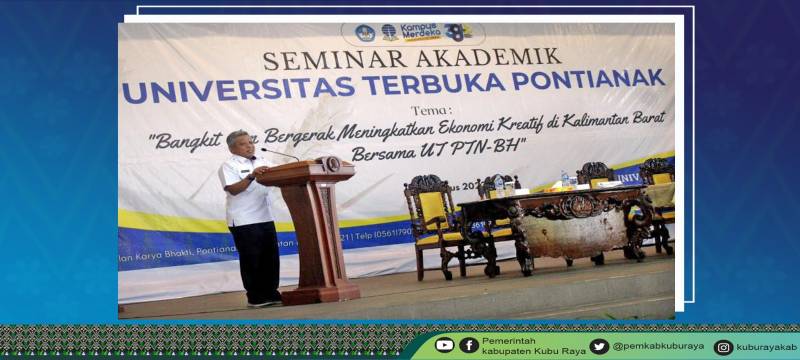 “Upaya Pemerintah Kabupaten Kubu Raya dalam meningkatkan sektor ekonomi kreatif dilakukan dengan berbagai cara. Salah satunya dengan memperkuat pengembangan desa wisata melalui pelibatan berbagai aspek pemberdayaan masyarakat lokal sehingga dapat meningkatkan perekonomian desa,” kata Bupati Muda Mahendrawan saat menjadi pemateri pada Seminar Akademik Universitas Terbuka Pontianak, Rabu (30/8), di Gedung Auditorium Universitas Tanjungpura Pontianak. Seminar yang digelar dalam rangka Wisuda Tahun 2023 itu mengangkat tema “Bangkit dan Bergerak Meningkatkan Ekonomi Kreatif di Kalimantan Barat”.