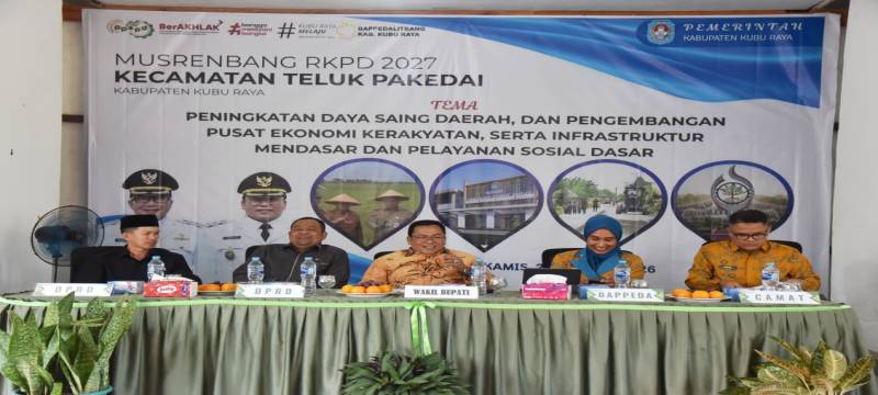 PROKOPIM KUBU RAYA - Pemerintah Kabupaten Kubu Raya berkomitmen memperkuat daya saing wilayah melalui pembangunan infrastruktur dan pengembangan ekonomi kerakyatan. Hal itu ditegaskan Wakil Bupati Kubu Raya Sukiryanto saat menghadiri Musyawarah Perencanaan Pembangunan (Musrenbang) Kecamatan Teluk Pakedai, Kamis (29/1/2026), di Aula Kantor Camat Teluk Pakedai. Wakil Bupati Sukiryanto menyampaikan Musrenbang Kecamatan Teluk Pakedai merupakan rangkaian Musrenbang keenam yang telah dilaksanakan pemerintah daerah tahun ini. Ia mengungkapkan sejumlah usulan pembangunan yang diajukan sebelumnya telah mulai terealisasi pada tahun anggaran 2026.