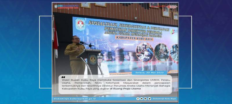 Kubu Raya - Wakil Bupati Kubu Raya membuka Sosialisasi dan Sinergisitas UMKM, Pelaku Usaha, Pemerintah, NGO, Kelompok Masyarakat dalam pencapaian terbentuknya dan terpilihnya Direktur Perumda Aneka Usaha Menanjak Bahagia Kabupaten Kubu Raya yang digelar di Ruang Praja Utama pada Selasa, (30/05).
